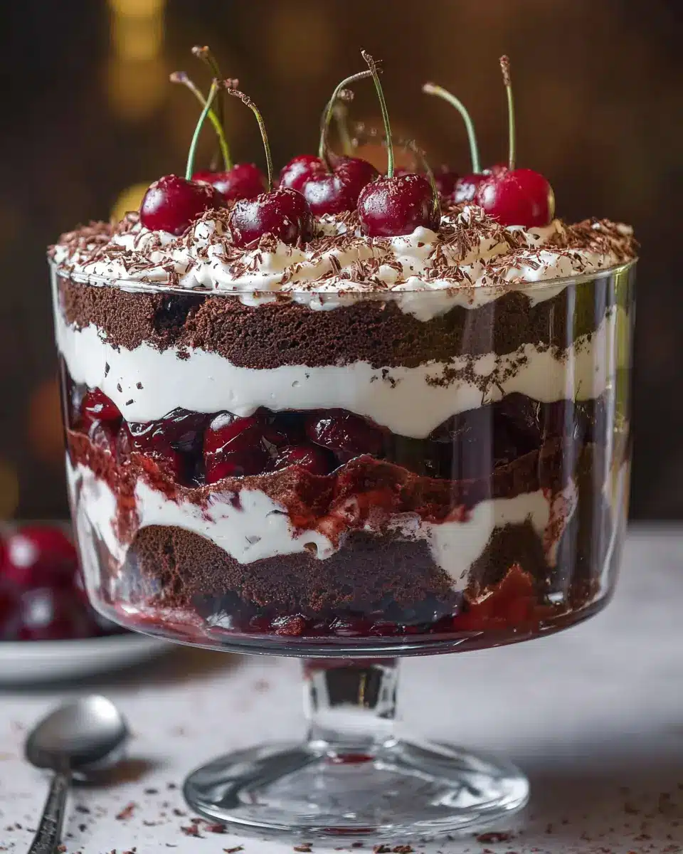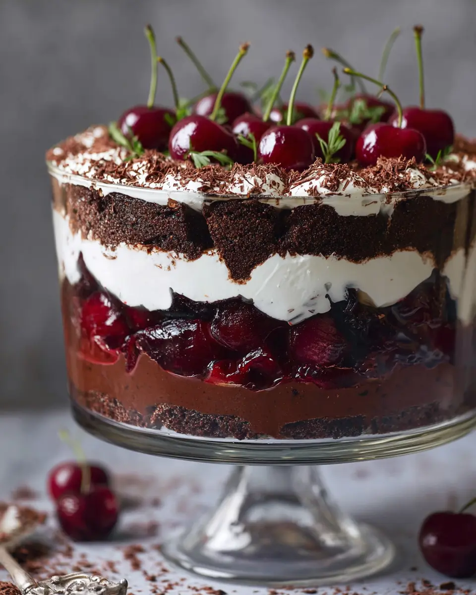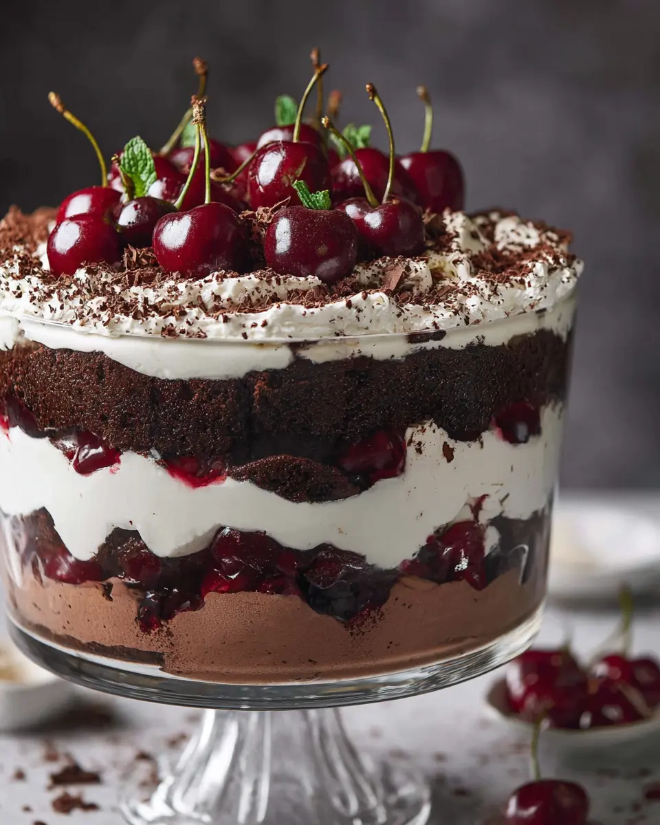 Elevate your black forest trifle with stunning presentations! Consider using individual glass cups for each serving—this not only looks beautiful but also keeps things neat. Layering the ingredients in a clear dessert dish allows your guests to admire those decadent layers of chocolate, cherries, and cream. You can even top each cup with garnishes like fresh cherries or chocolate shavings for that perfect finishing touch. For an outdoor gathering, a mason jar trifle can add a rustic charm, making it easy for guests to grab and enjoy.