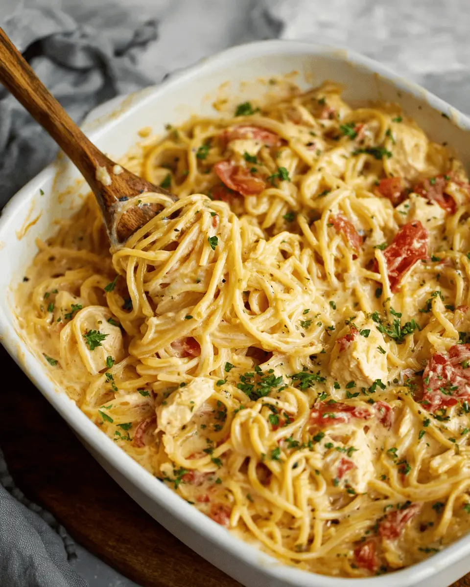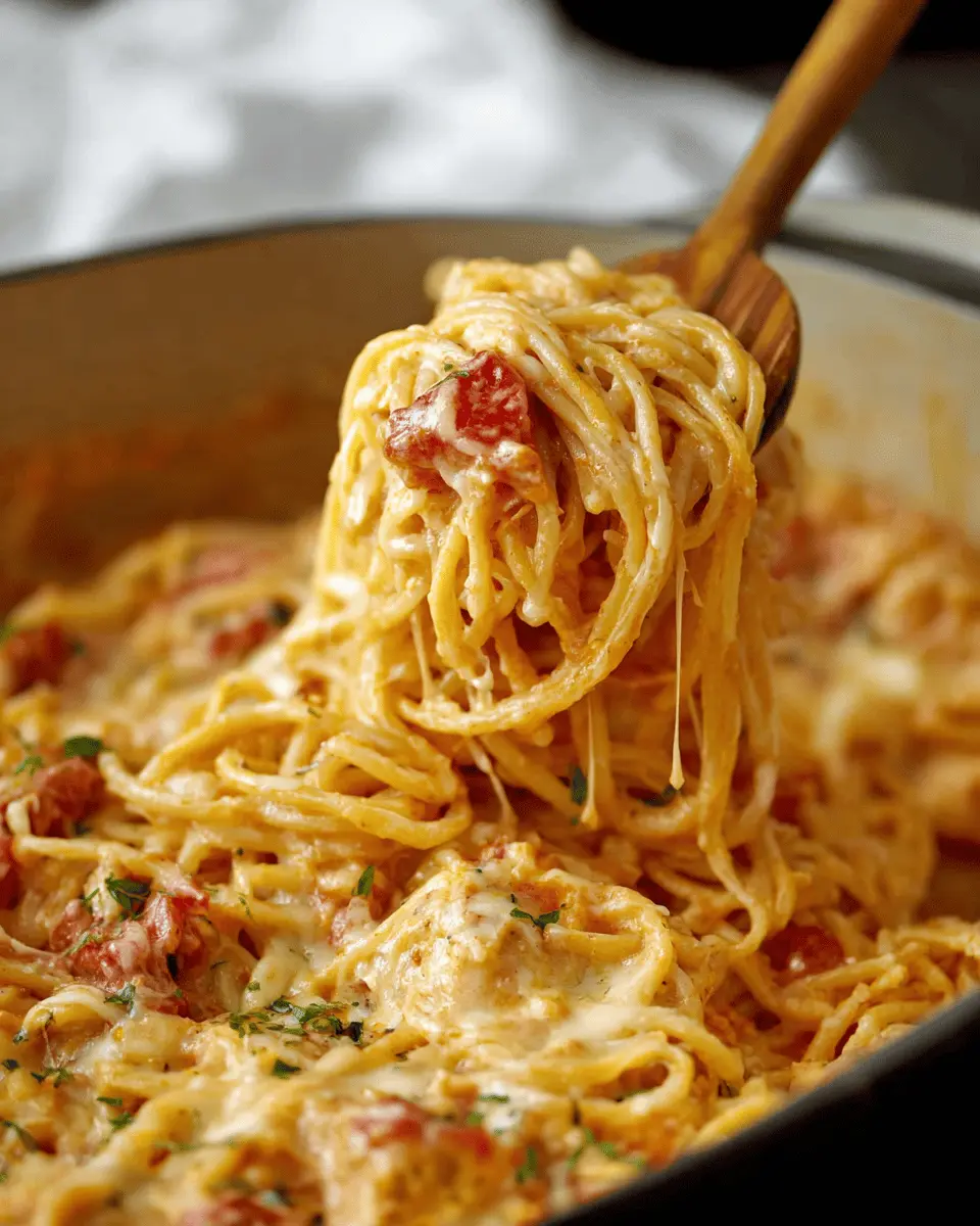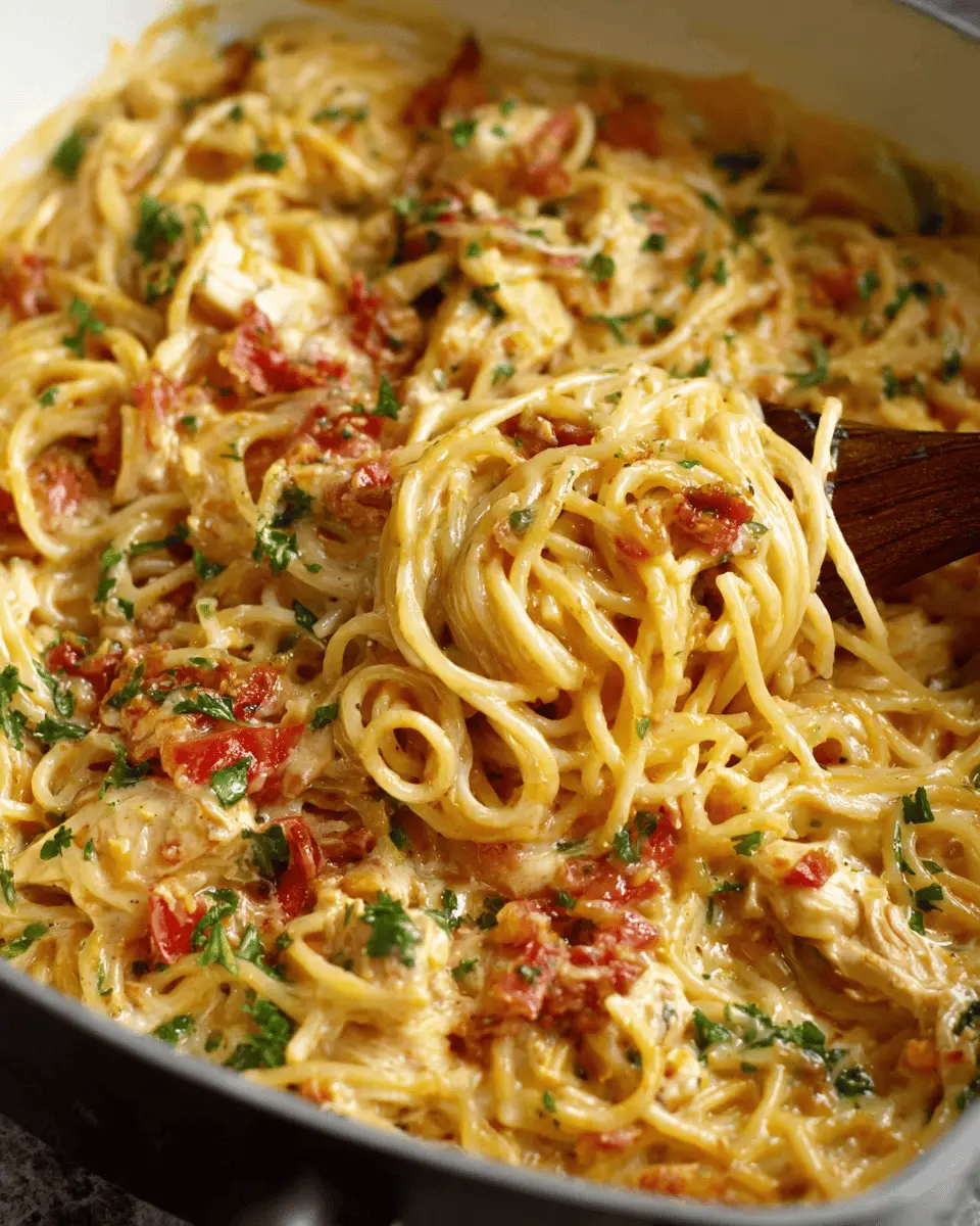After allowing the chicken to rest, chop it into bite-sized pieces. Add the diced tomatoes with green chiles, alongside the chopped chicken and drained spaghetti, to your creamy sauce. Mix well until everything is beautifully combined.