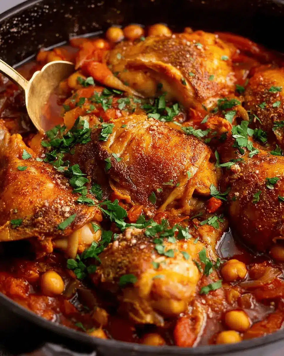 Now, it’s time to build that rich sauce. Pour in the crushed tomatoes, drained chickpeas, your plumped apricots, chicken stock, and chopped preserved lemon. The zing from the preserved lemon adds that remarkable tanginess that is characteristic of a true Chicken Tagine. Don’t forget to place the chicken back in, skin side up; this allows the flavors to meld beautifully.