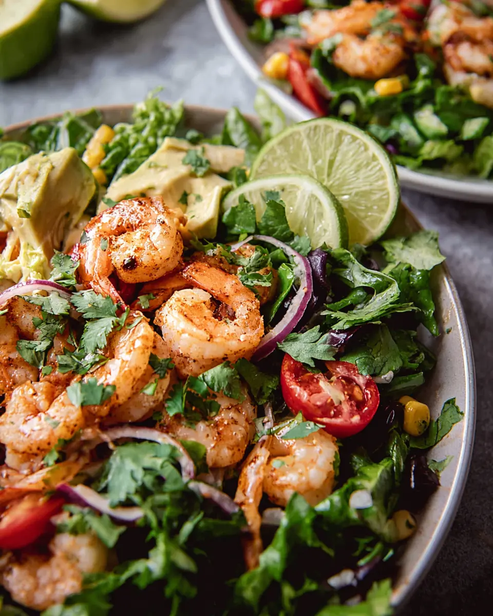 Finally, it’s time to plate your masterpiece! Divide the salad mixture into four shallow bowls. Arrange five shrimp around the edges of each bowl for that perfect presentation. Drizzle a bit more of the cilantro-lime vinaigrette on top, and don’t forget the finishing touches: top with crispy tortilla strips, a fresh sprig of cilantro, and a wedge of lime. Serve immediately with extra dressing on the side for those who like a little additional zing.