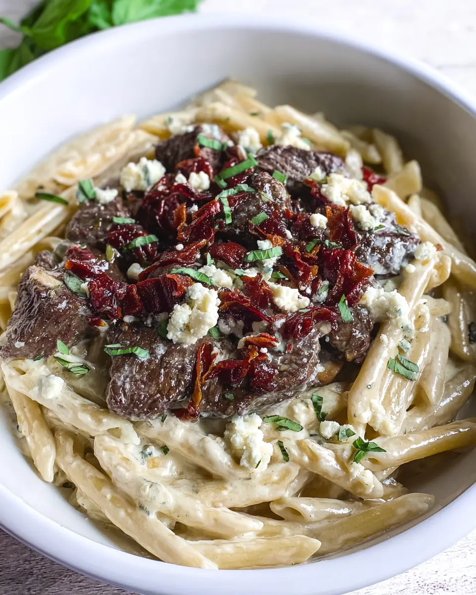 Now for the finishing touches! Gently stir in 4 ounces of gorgonzola crumbles—this will create creamy pockets of flavor throughout. Serve your pasta on plates, topping each portion with the sliced steak medallions, a drizzle of balsamic glaze, a sprinkle of sundried tomatoes, and more gorgonzola crumbles for a rustic feel. You’ll find that these toppings elevate your dish from simple to spectacular.