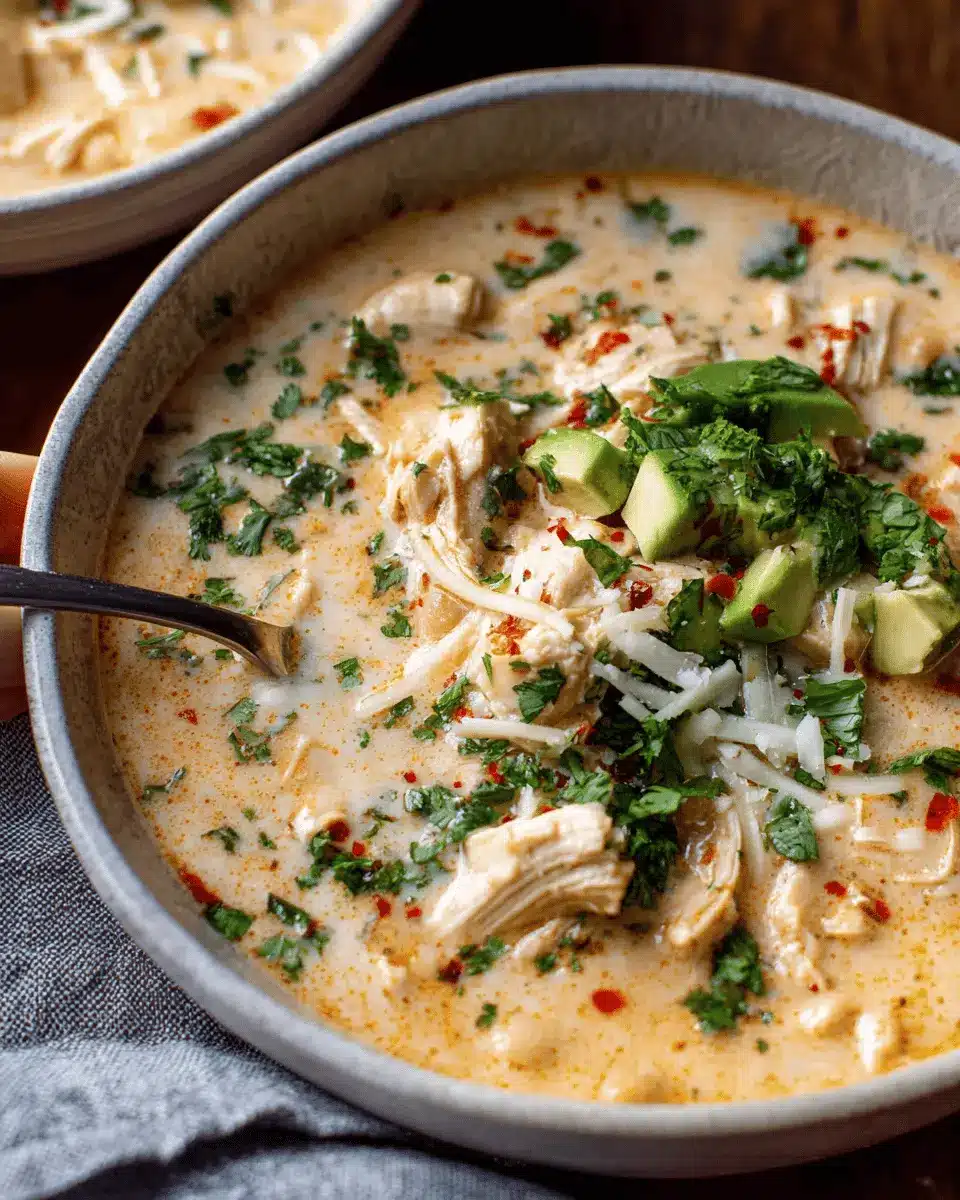 Finally, remove the pot from heat and stir in ½ cup of freshly chopped cilantro for that burst of freshness. If your chili appears too thick, feel free to thin it out with additional broth! Now, it’s time to ladle your comforting Creamy White Chicken Chili into bowls. Top each serving with your favorite garnishes like yogurt or sour cream, avocado slices, extra cheddar cheese, and a sprinkle of lime zest for a refreshing finish. Enjoy every spoonful!