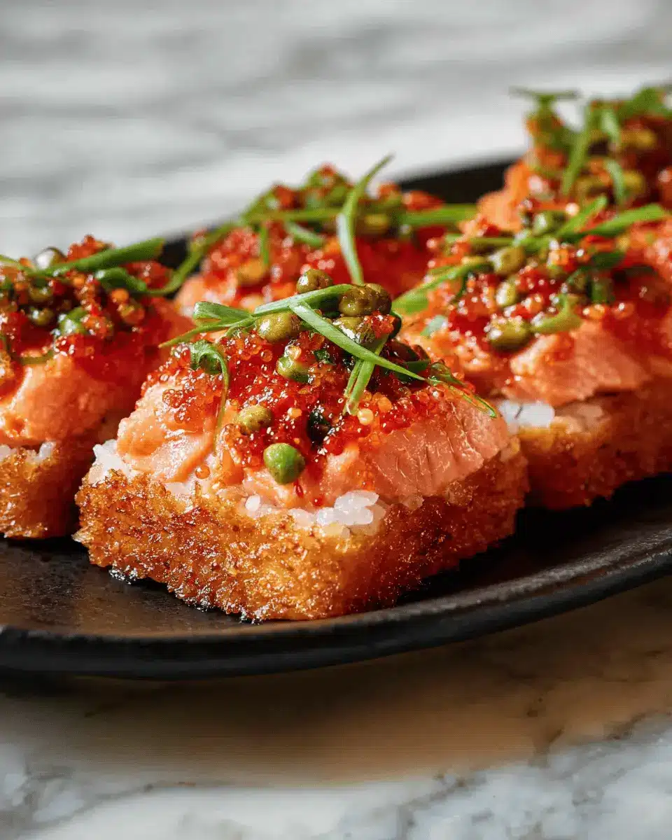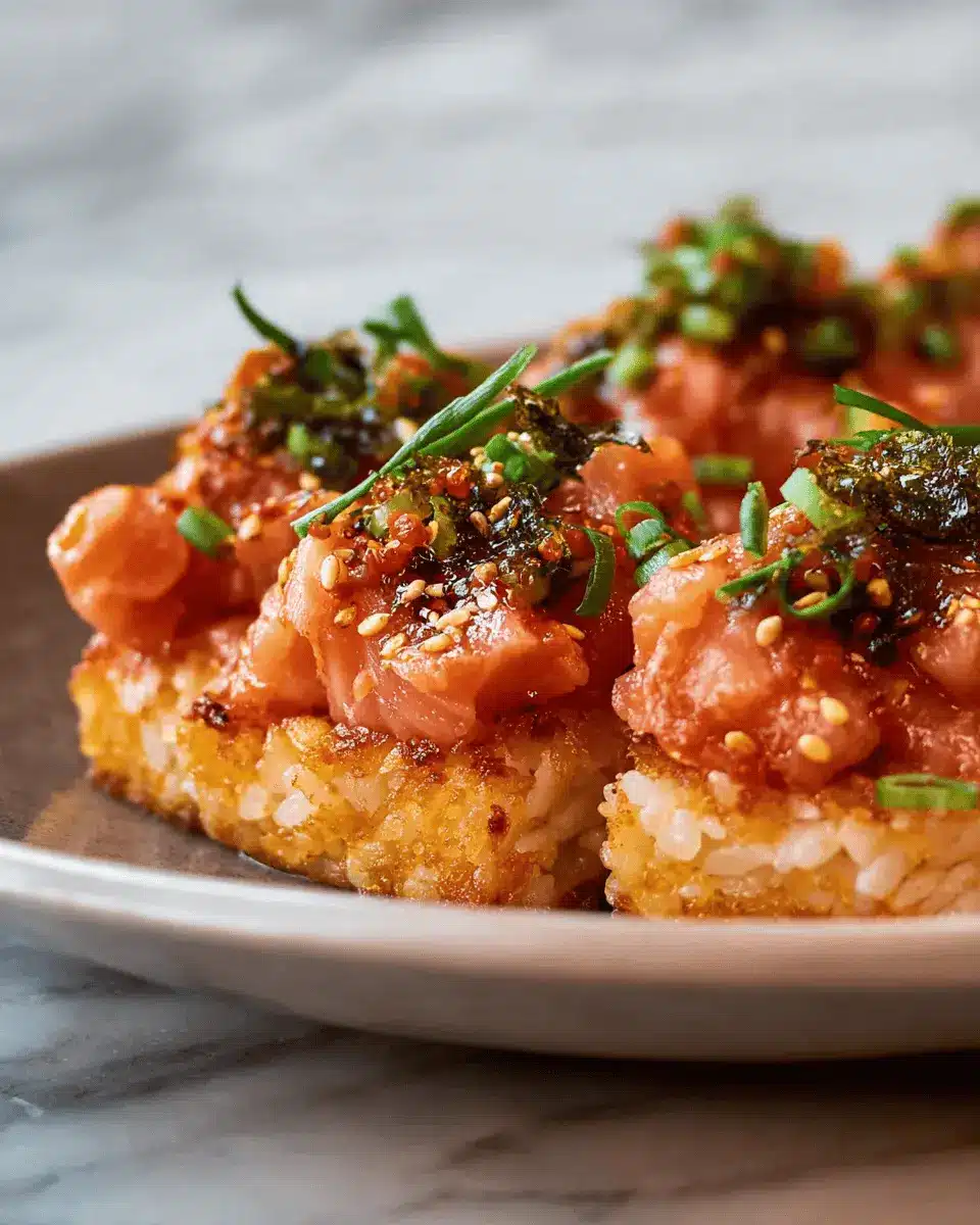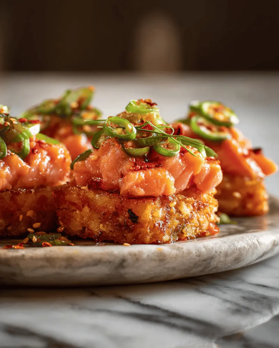 Imagine biting into perfectly golden, crispy rice paired with fresh, sushi-grade salmon enveloped in a velvety, spicy mayonnaise. It's a fusion of textures and flavors that will elevate your dinner game without consuming an entire evening. Moreover, the ingredients are easy to source—check out your local markets or online grocery stores for fresh fish and pantry staples like rice vinegar and sriracha.