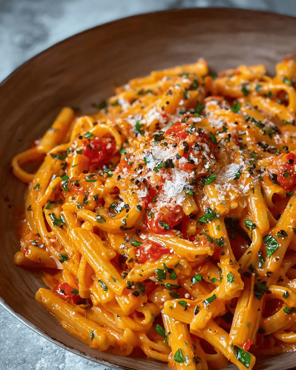 It's time to plate up! Garnish with freshly grated Parmesan, a sprinkle of black pepper, and an extra handful of parsley for a pop of color. And there you have it—the perfect bowl of Easy and Creamy Tomato Garlic Pasta. Dive in, and don’t forget to share with your friends—you’ll definitely want to show off this delicious dish!