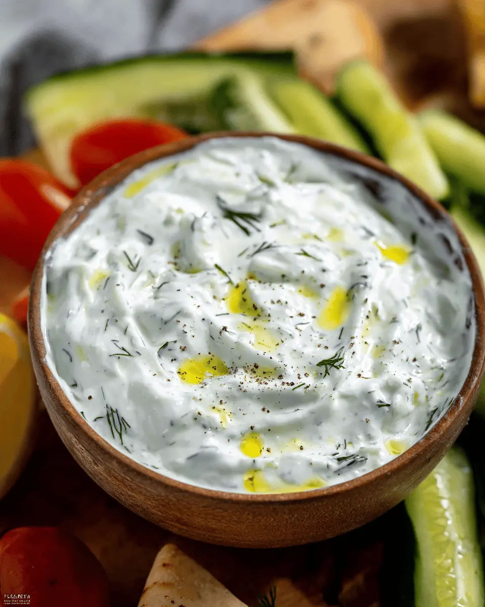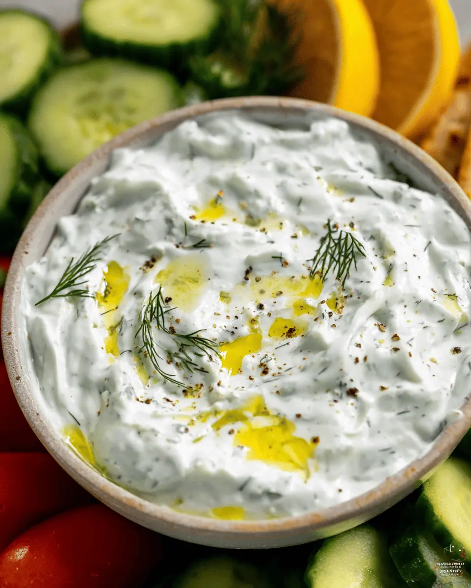 - When ready to serve, stir the tzatziki sauce, transfer to a serving bowl, and drizzle with more olive oil if desired. Serve with veggies or pita.