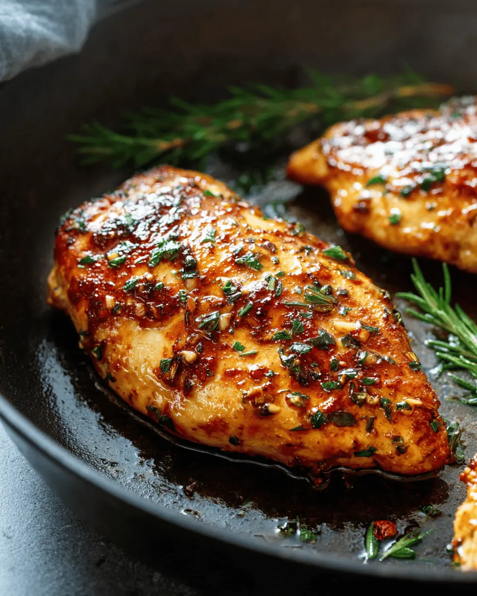 - Remove from the oven. Using a spoon, pour some of the butter sauce left in the skillet onto the chicken breast. Also, if you prefer, top with fresh herbs before serving.