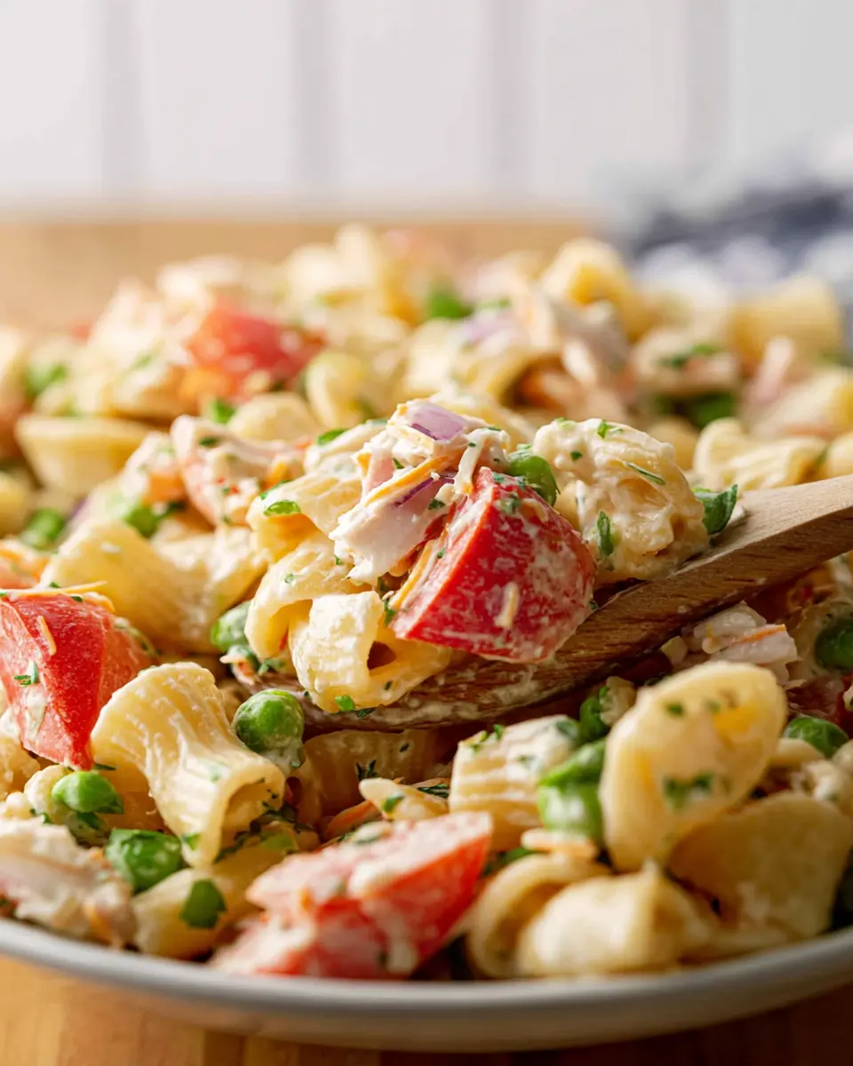 - Add the dressing to the pasta mixture and gently stir to coat as evenly as possible.
