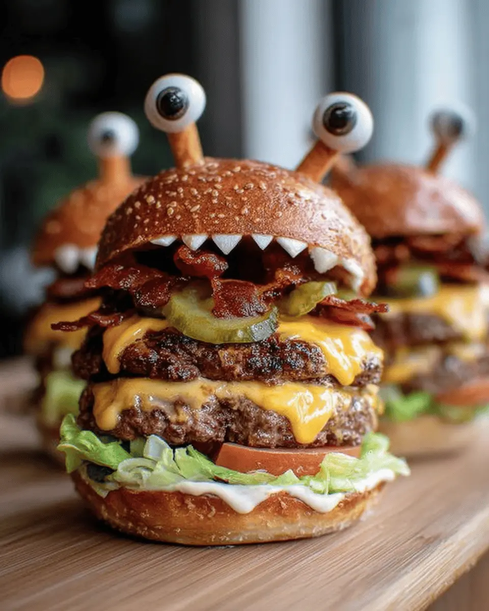 Finally, it’s time for the grand assembly! Slice your burger buns in half and spread a bit of ketchup on each bottom half. Place a patty on top, add a slice of cheddar, and creatively cut the remaining cheese into quirky tooth shapes. Add a tomato slice and place the top bun back on. For an extra touch, poke olive slices onto toothpicks and stick them into the patties to create fun “eyes.”