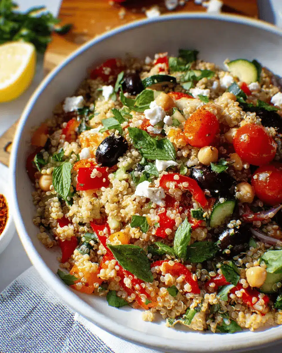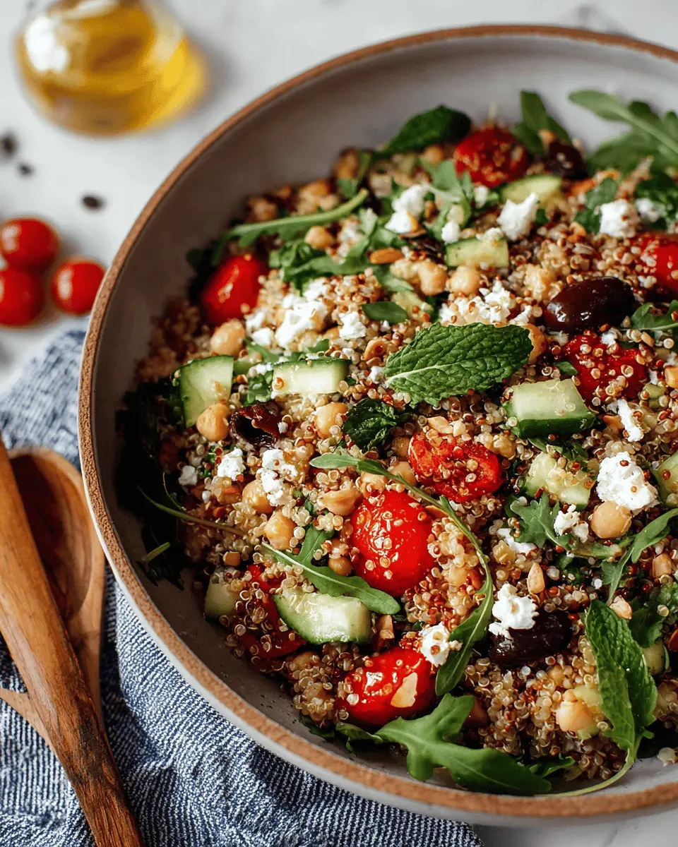 Elevate your quinoa salad presentation with just a few creative touches! Serve it in hollowed-out bell peppers or avocado halves for a colorful display. Use clear glass bowls to showcase the beautiful layers of ingredients, or plate it in individual portions, garnished with fresh herbs. A sprinkle of red pepper flakes on top can add a pop of color while enhancing the flavor. Feel free to experiment with different garnishes, like edible flowers or microgreens, to impress your guests and make every meal feel special!