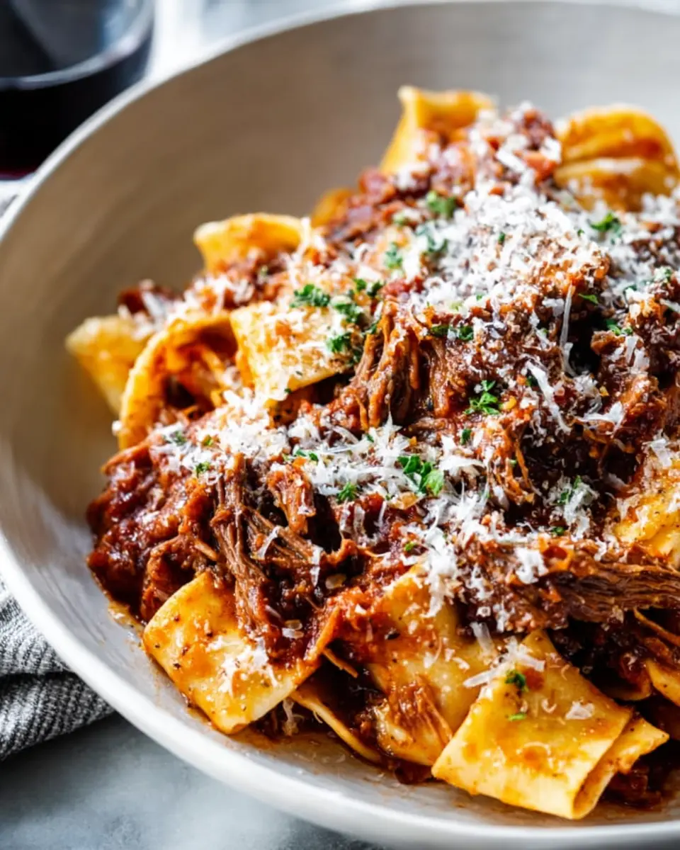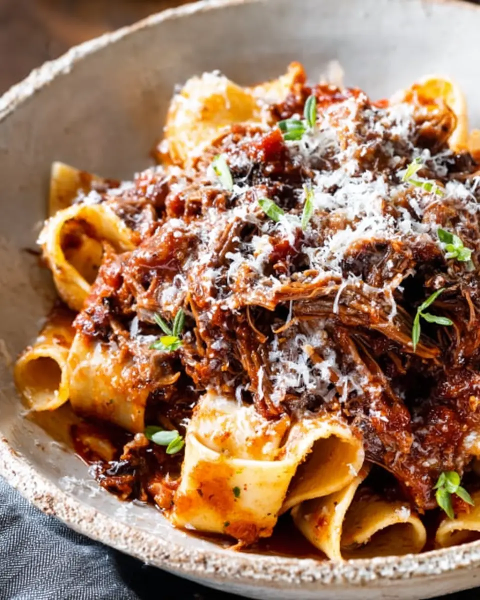 Presentation matters! Serve your short rib ragu in shallow, wide bowls. This allows guests to enjoy a generous portion of ragu and noodles while showcasing that gorgeous sauce. A sprinkle of fresh herbs like basil or parsley adds a pop of color, while fresh shaved Parmesan cheese on top ties everything together. For an extra special occasion, consider adding a small dollop of burrata cheese to each bowl for a creamy finish. Your guests (and their taste buds) will thank you!