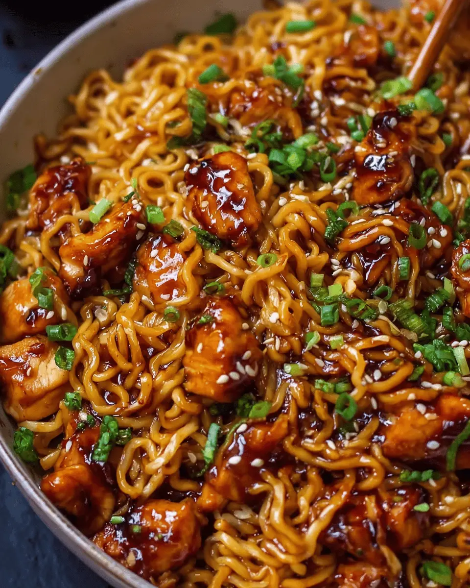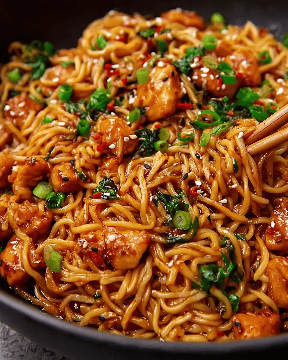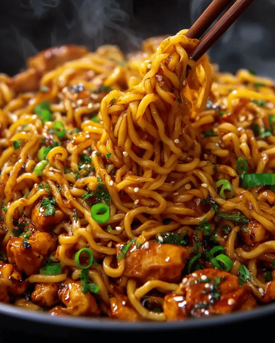 After the noodles are ready and your chicken is coated in that delicious sticky sauce, add the cooked noodles to the skillet. Gently toss everything together until the noodles are well combined with the chicken and the sauce. This is where the dish truly comes to life as the flavors meld together!