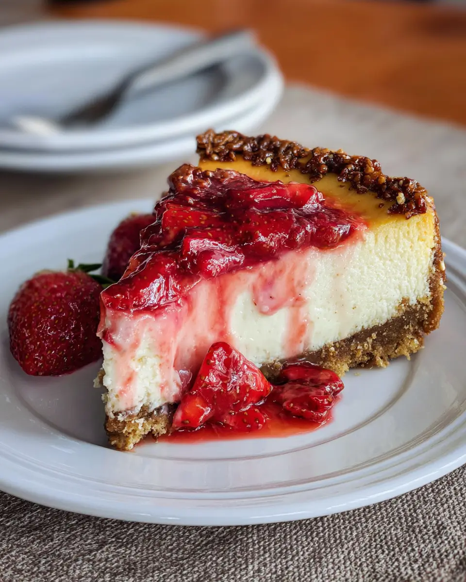 - Drizzle strawberry mixture over the cheesecake before serving.
