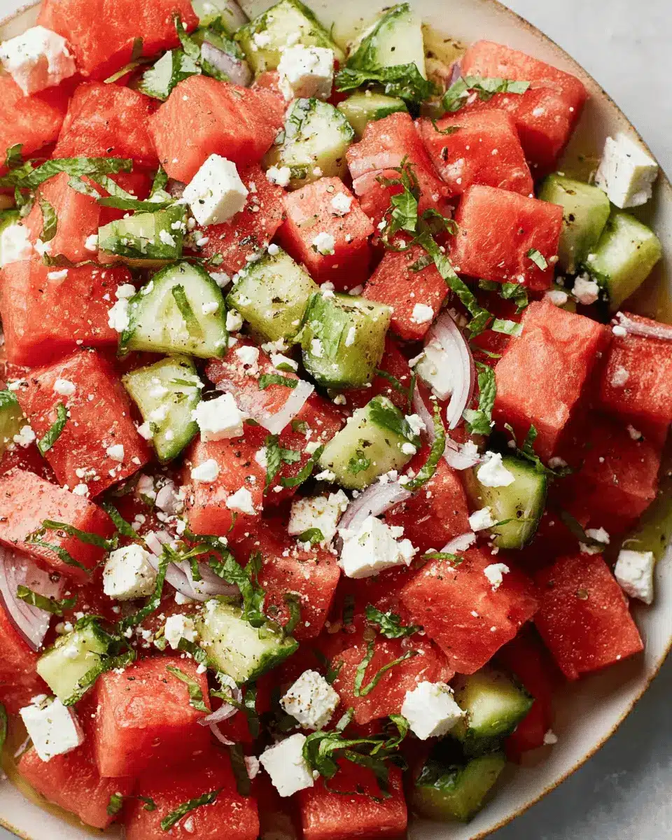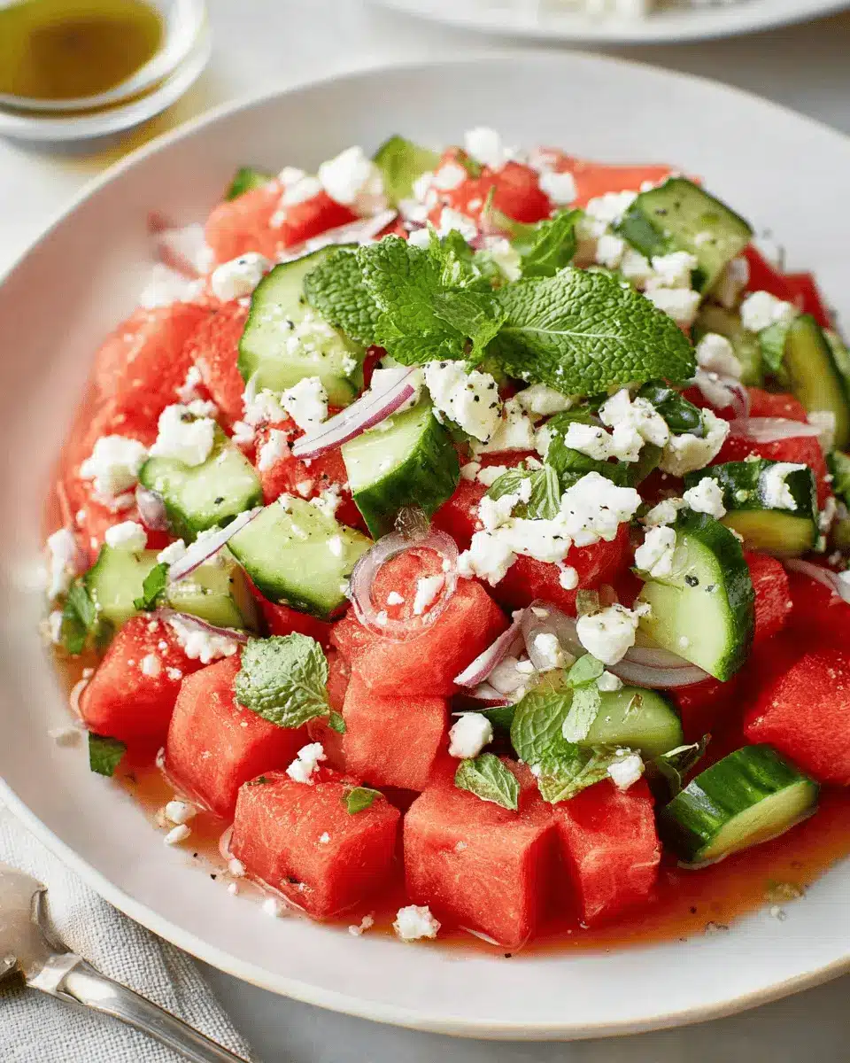 For a well-rounded dining experience, pair your watermelon salad with feta alongside grilled veggies or a light pesto pasta. Alternatively, consider serving it with a refreshing cucumber yogurt dip to complement the flavors. If you’re looking to elevate the experience, add a citrus-infused iced tea or sparkling water with fresh mint. These pairings not only enhance flavors but also create a visually appealing table spread!