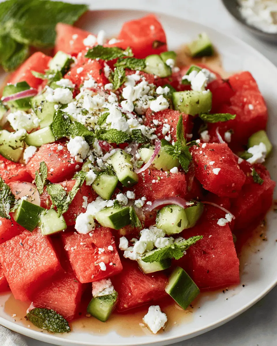 In conclusion, this watermelon salad with feta is the perfect blend of sweet and savory, ideal for summer gatherings or a refreshing weeknight dinner. Its vibrant colors and delightful textures offer a feast for the senses. Enjoy experimenting with flavors, and share your unique creations with friends!